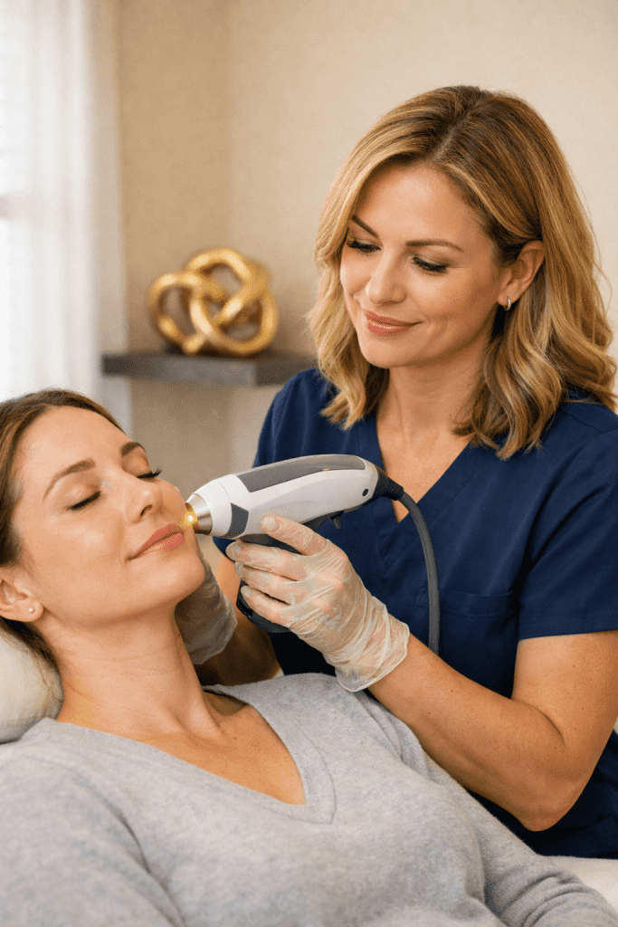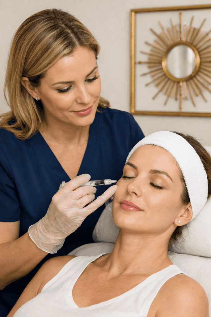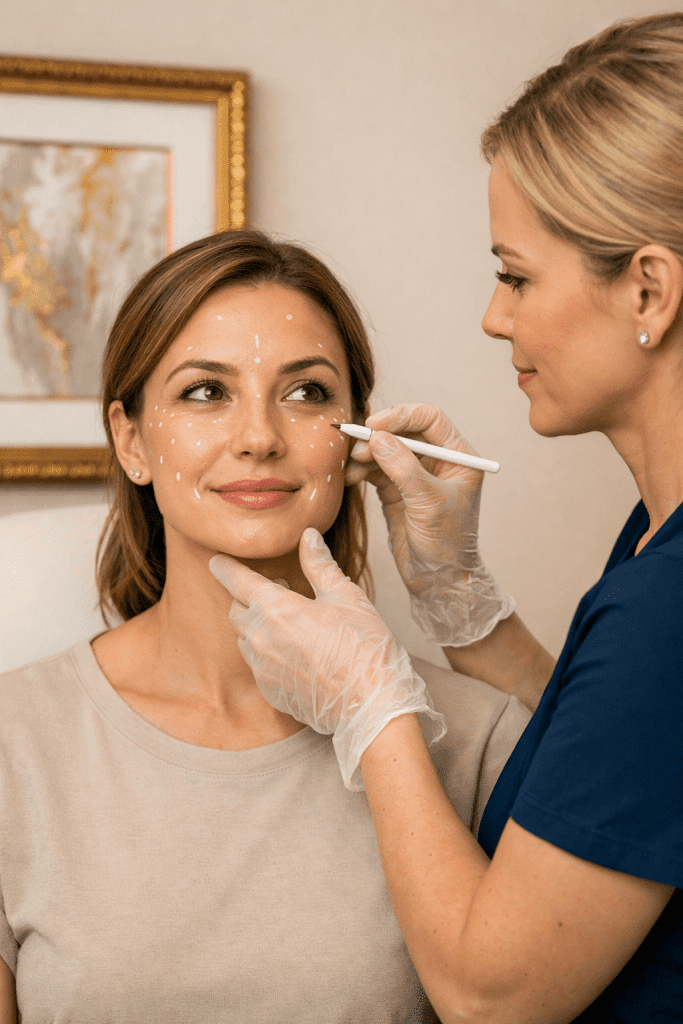 Initial results become noticeable with treatments like neuromodulators (Botox, Dysport) that begin relaxing facial muscles. Skin starts to look smoother in motion, with a more refreshed expression.
